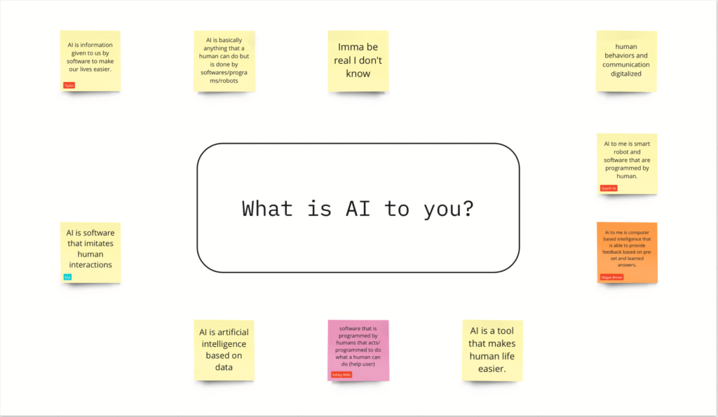 As an introduction to the topic, students were asked to share on an online whiteboard platform (Miro) what AI is to them. Student responses are below.